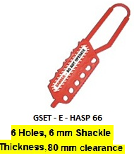 TAGO HASP- RED 6 HOLE TAGO HASP combines the benefits of a standard hasp & a tag simultaneously. Manufactured from powder coated aluminium sheet. Available in different colors. Supplied with one set of spare labels. Tags can be customized. Shackle thickness 6.5 mm. 6 padlocks can be installed on this hasp.