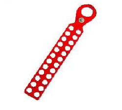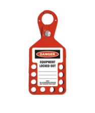 TAGO HASP- RED 8 HOLE TAGO HASP combines the benefits of a standard hasp & a tag simultaneously. Manufactured from powder coated aluminium sheet. Available in different colors. Supplied with one set of spare labels. Tags can be customized. Shackle thickness 6.5 mm. 8 padlocks can be installed on this hasp.