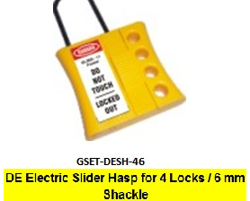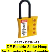 De – Electric Slider Hasp for 4 Locks – 6 mm Shackle Model No: GSET-DESH-46 De – Electric 4 hole slider designer hasp with 3 mm and 6 mm shackle sizes. Available in the Set of 2 hasps. Made from hard Nylon. Highly Visible. Best recommended for Electrical Panels, MCB’s, etc.